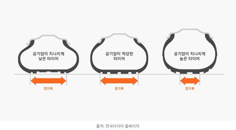 위 이미지를 보시면 타이어의 공기압에 따라 도로면에 닿는 타이어의 접지폭에 변화가 생기는 걸 알 수 있습니다.